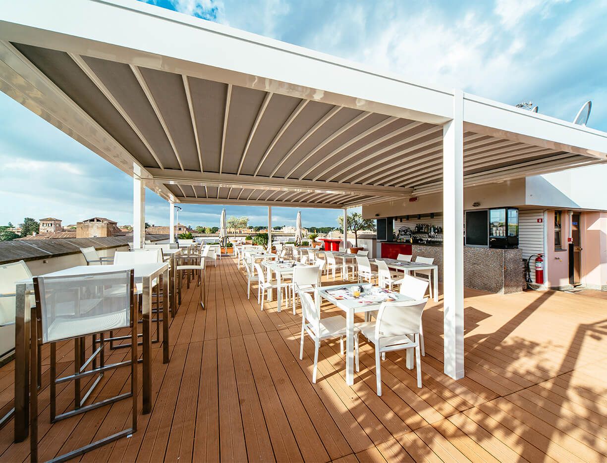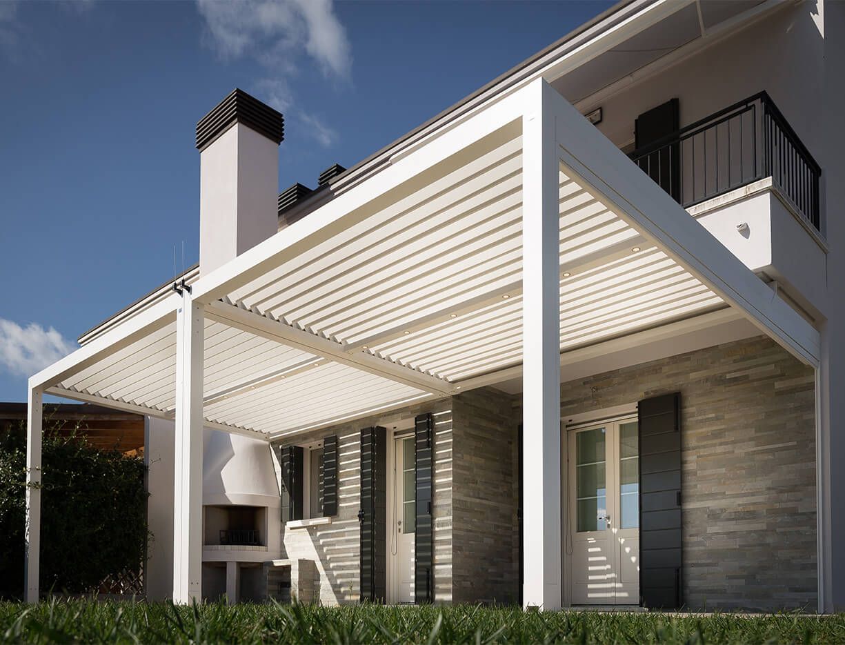 Wasserdichtes Lamellendach aus Aluminium mit schwenkbaren Lamellen.
